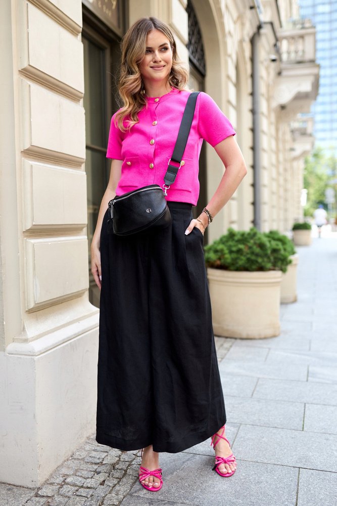 Do saszetki dołączony jest szeroki pasek w kolorze torebki, o długim zakresie regulacjiDzięki temu będzie idealnie dopasowana niezależnie od wzrostu i sylwetki. Na jego końcach zostały przymocowane karabińczyki, za sprawą których można sprawnie wypiąć pasek.
