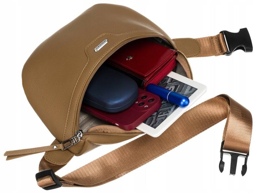 - Główną komorę o bardzo dużej pojemności. Idealnie sprawdzi się ona na przechowywanie telefonu, portfela, etui na okulary czy drobne kosmetyki. Pomieści również mniejszego tableta.
