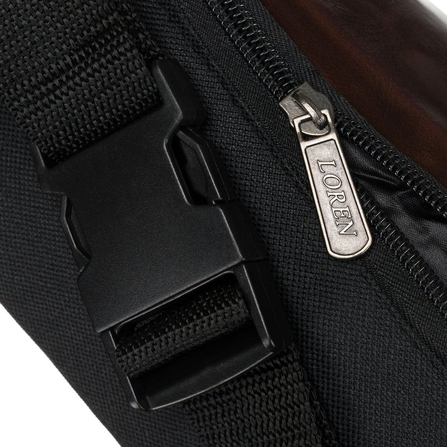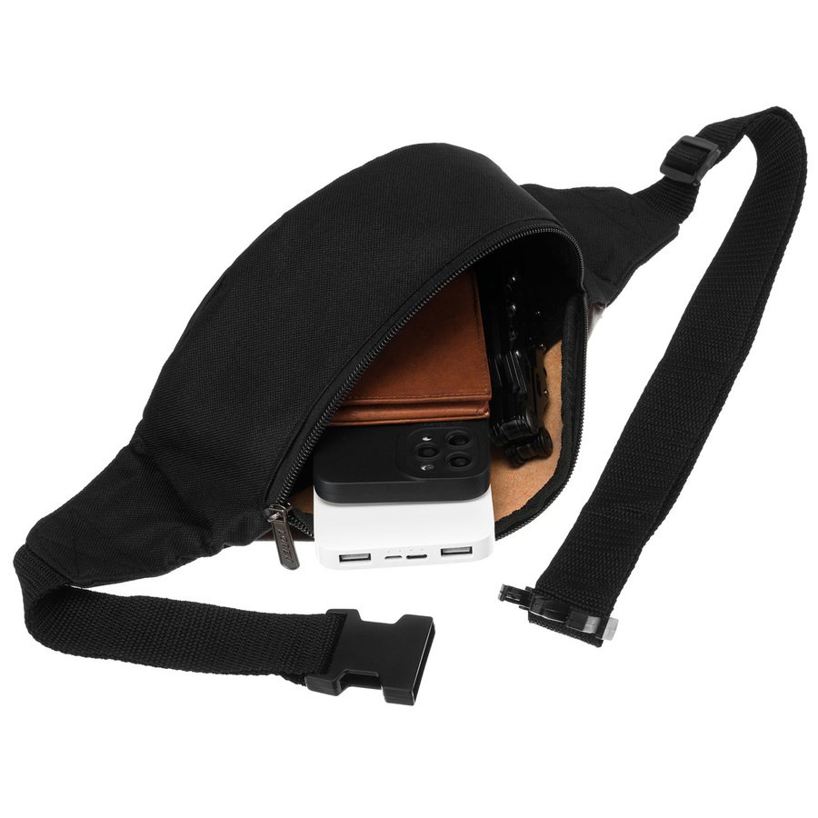 - Regulowany pasek, pozwalający dopasować saszetkę do sylwetki.