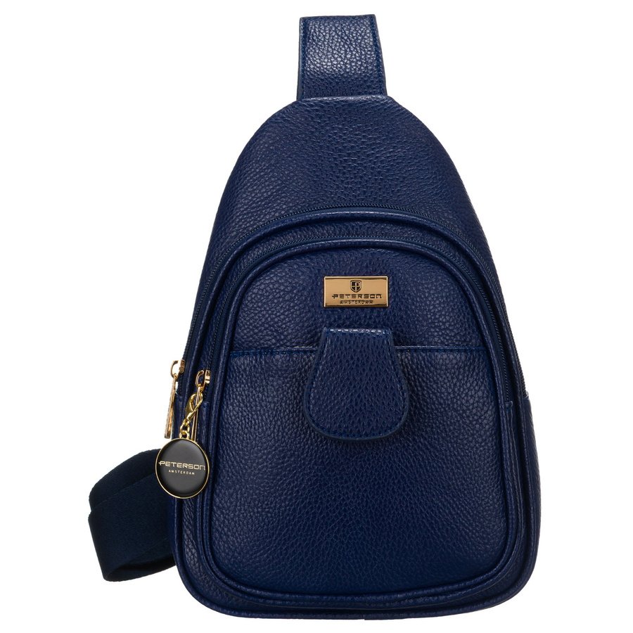 Mała miejska saszetka damska na ramię lub przez ramię crossbody granatowa ze złotymi okuciami eko skóra Peterson