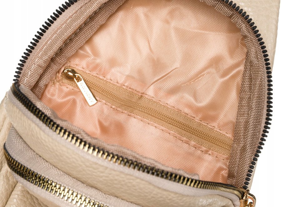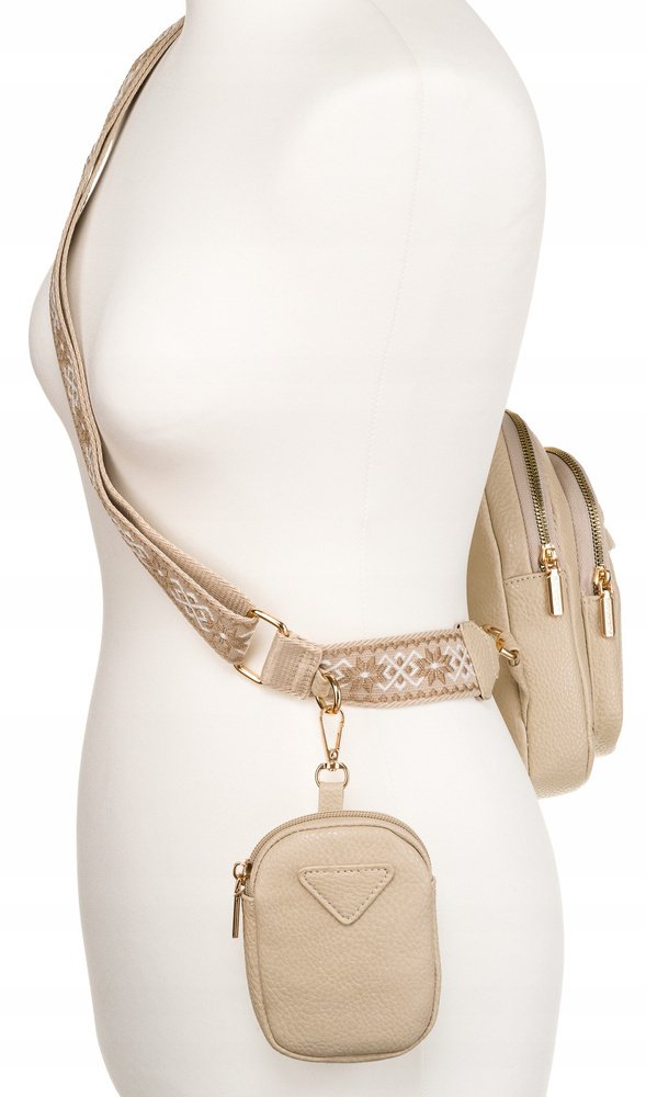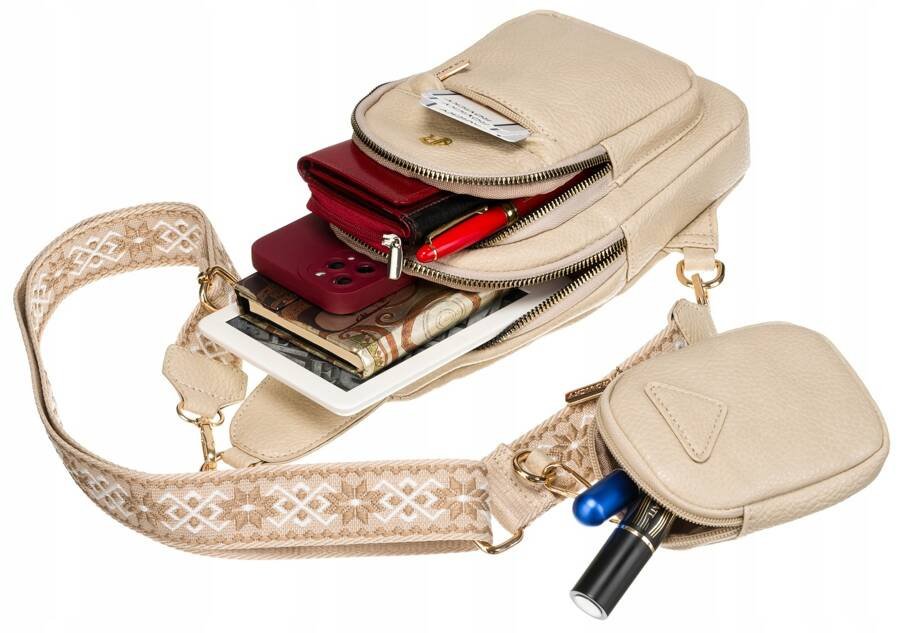 Wraz z saszetką otrzymasz małą portmonetkę zamykaną na suwak, do której możesz włożyć karty płatnicze, małe kosmetyki, bilon lub inne drobne rzeczy. Portmonetka jest przyczepiona do saszetki za pomocą karabińczyka.