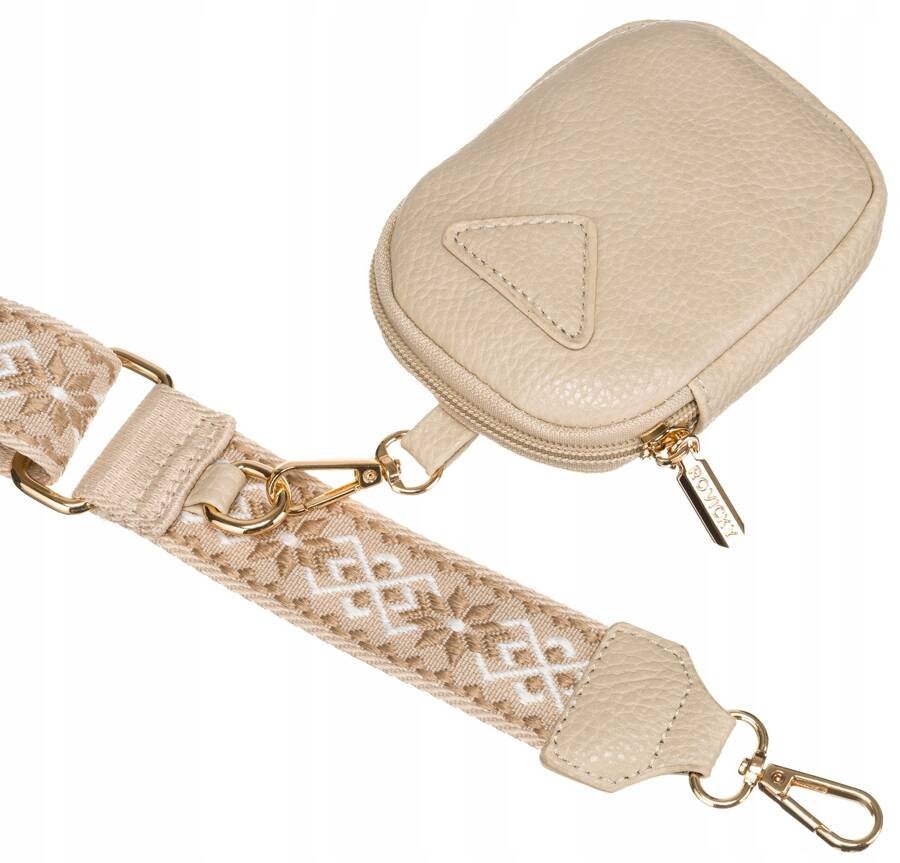 Saszetka zawieszona na parcianym pasku o szerokości 3,5 cm i regulowanej długości (74-125 cm).