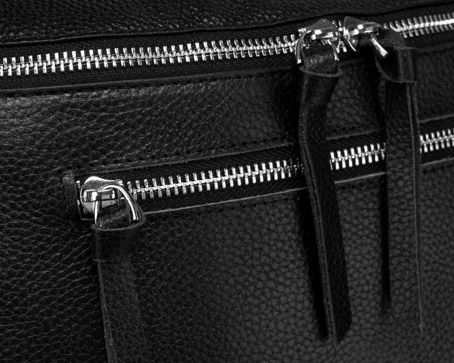 - 2 zewnętrzne schowki na zamek błyskawiczny: jeden umieszczony na przodzie torebki, drugi na jej tyle.