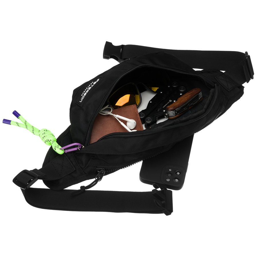 Praktyczna, miejsko sportowa saszetka wykonana z poliestru w czarnym kolorze. Idealna do stylizacji casual, sportowych i streetwearowych. Posiada 2 praktyczne kieszonki. Zawieszona na regulowanym pasku.